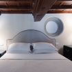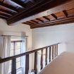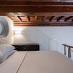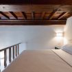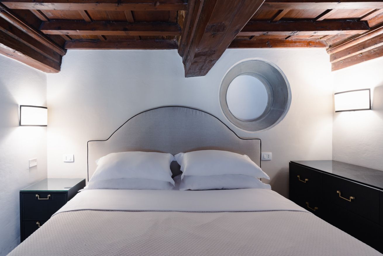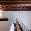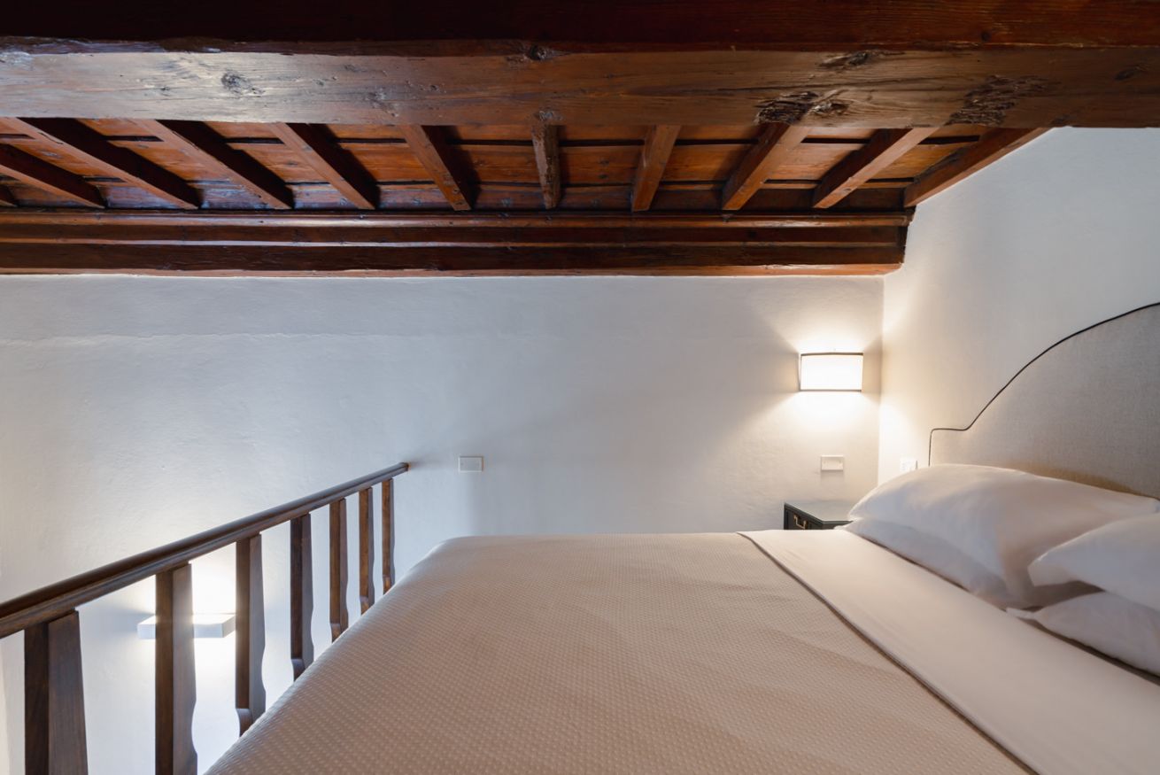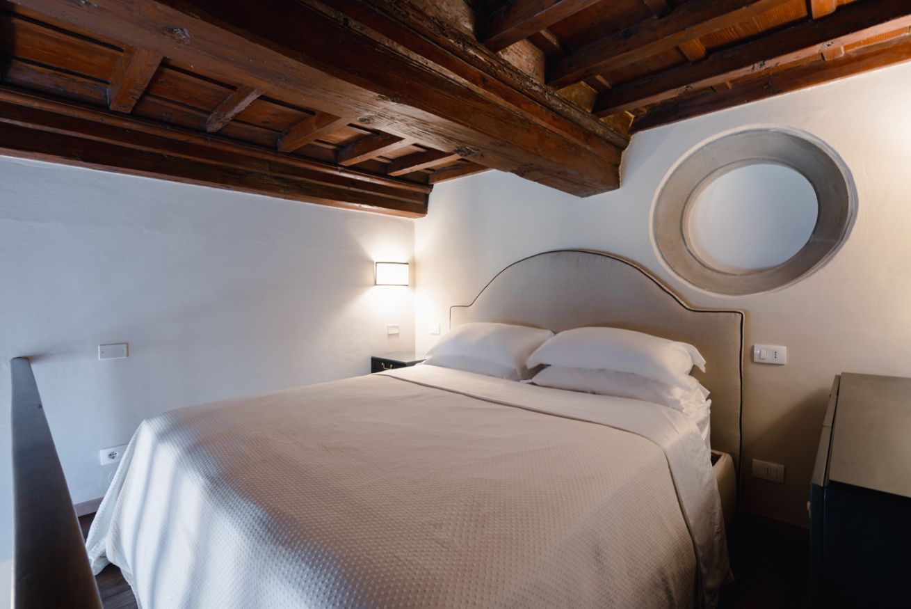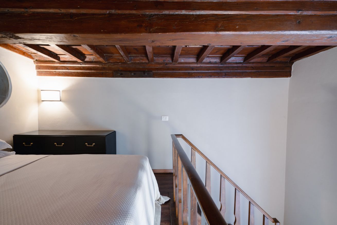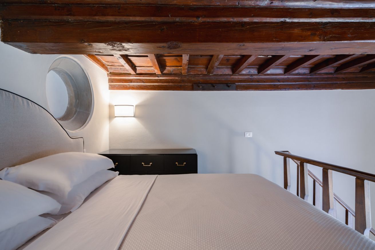 Camera da letto: situata su un soppalco, con letto matrimoniale, travi in legno a vista e dettagli architettonici originali, tra cui un'antica apertura circolare in pietra. Lo spazio è intimo e romantico, ideale per le coppie.