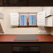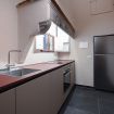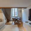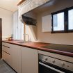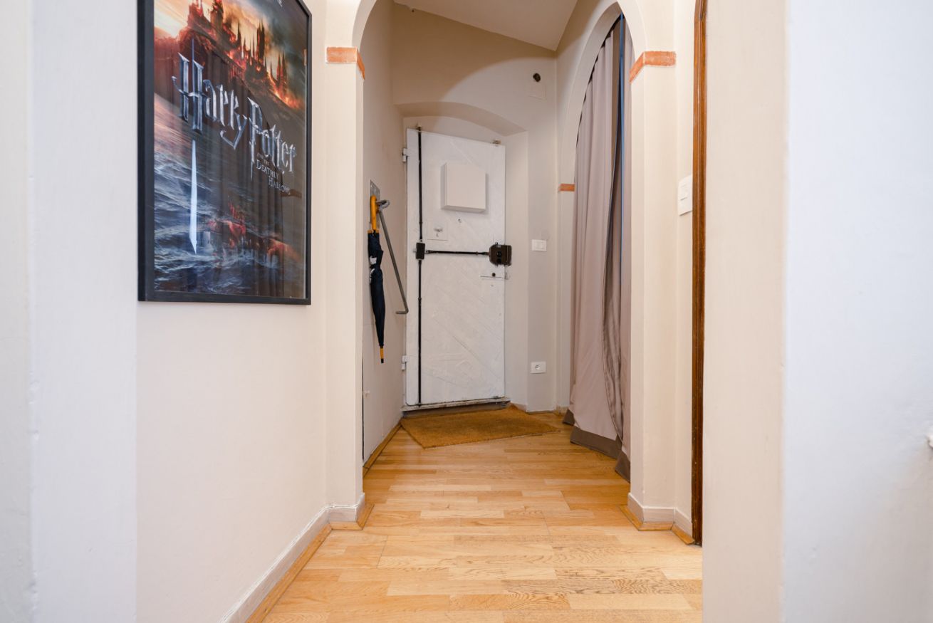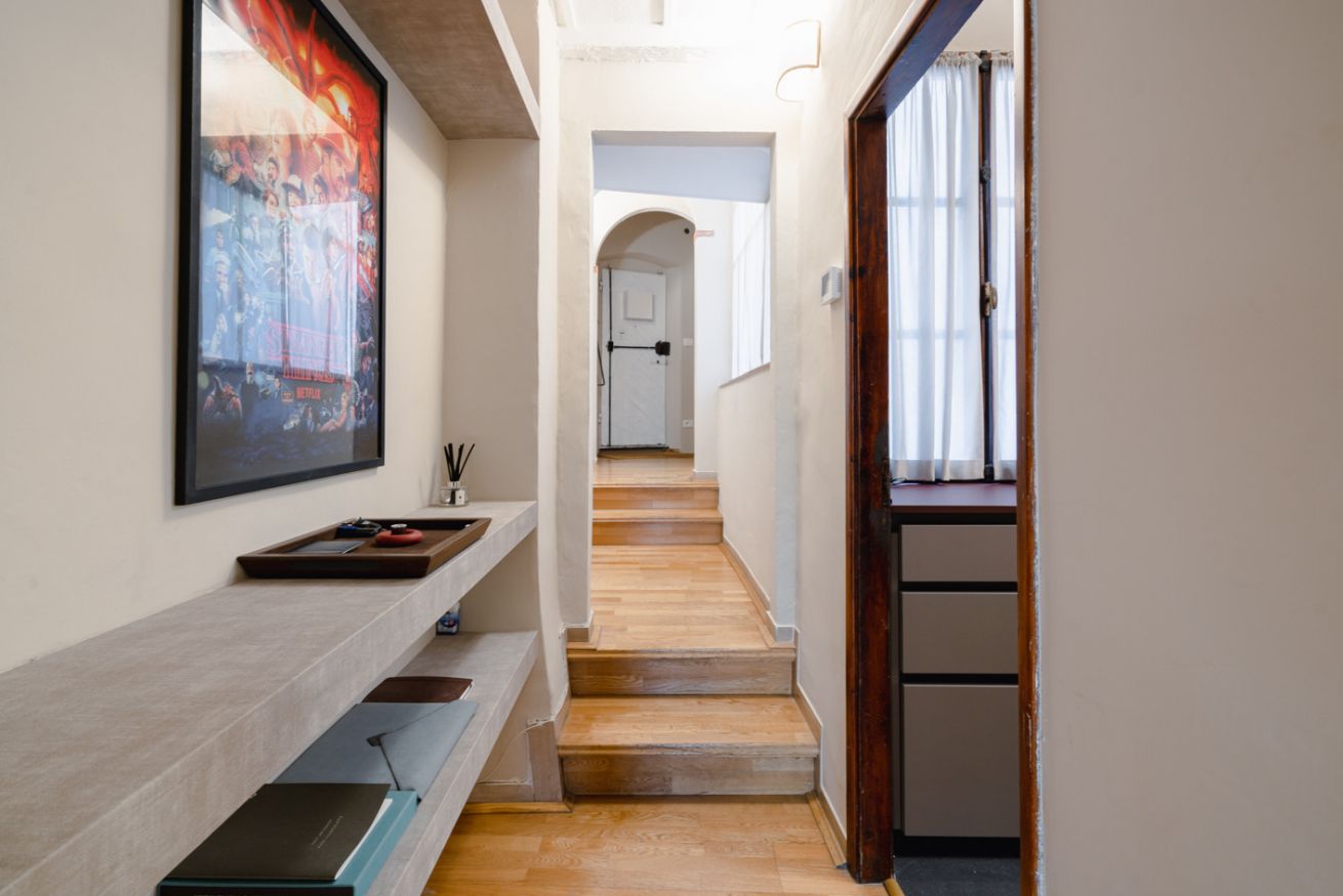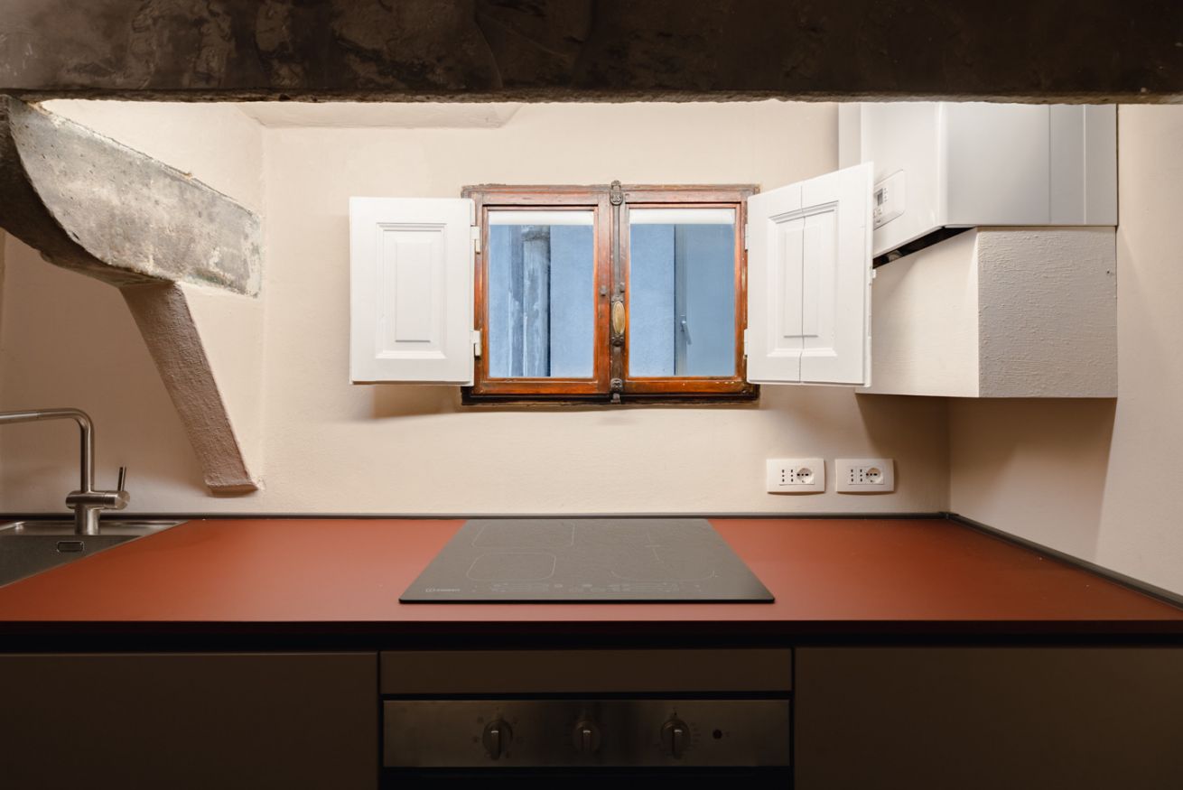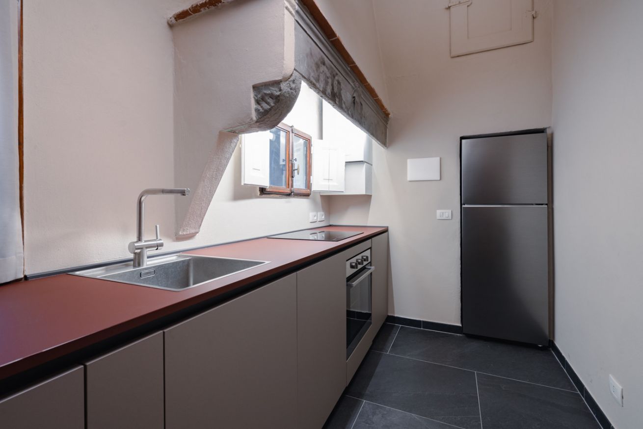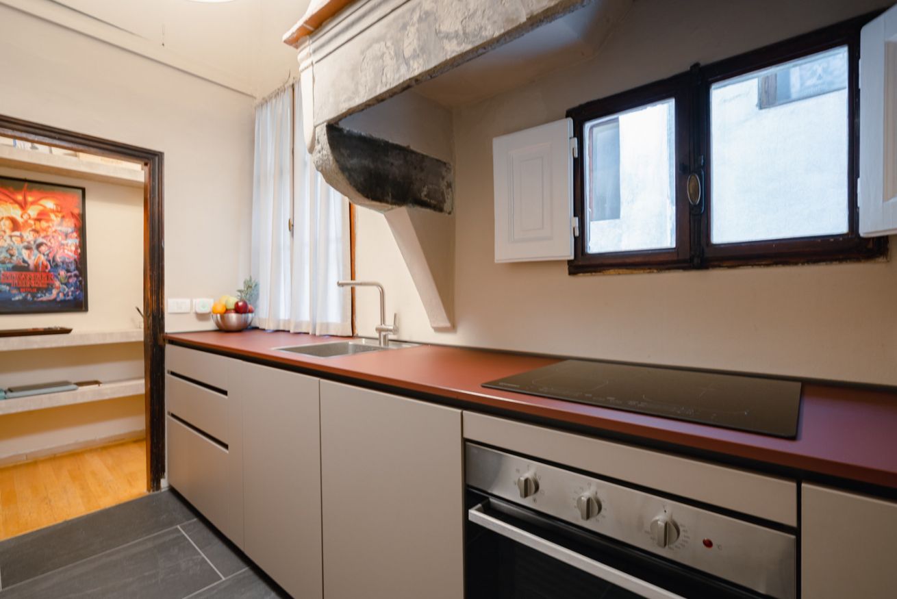 Cucina: moderna e ben attrezzata, con piano cottura a induzione, forno, frigorifero e ampio spazio sul bancone. Il design minimalista si fonde perfettamente con gli elementi architettonici storici ancora visibili.