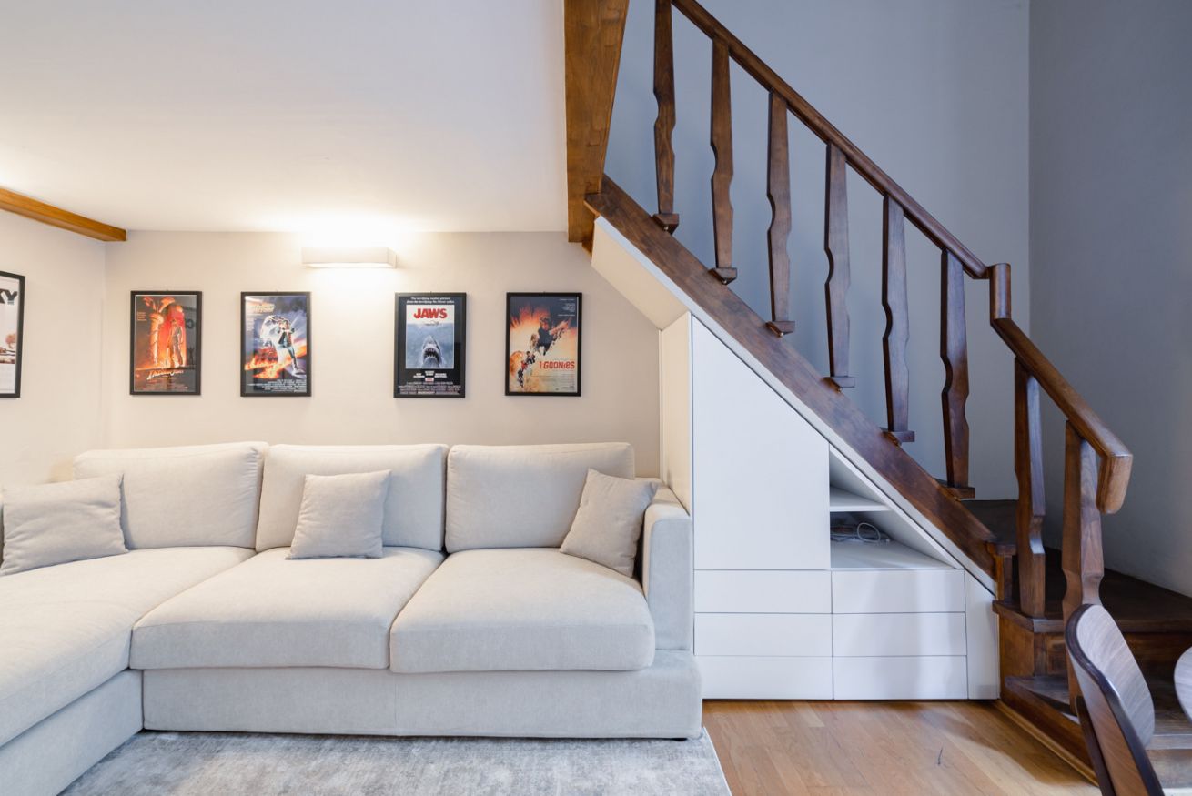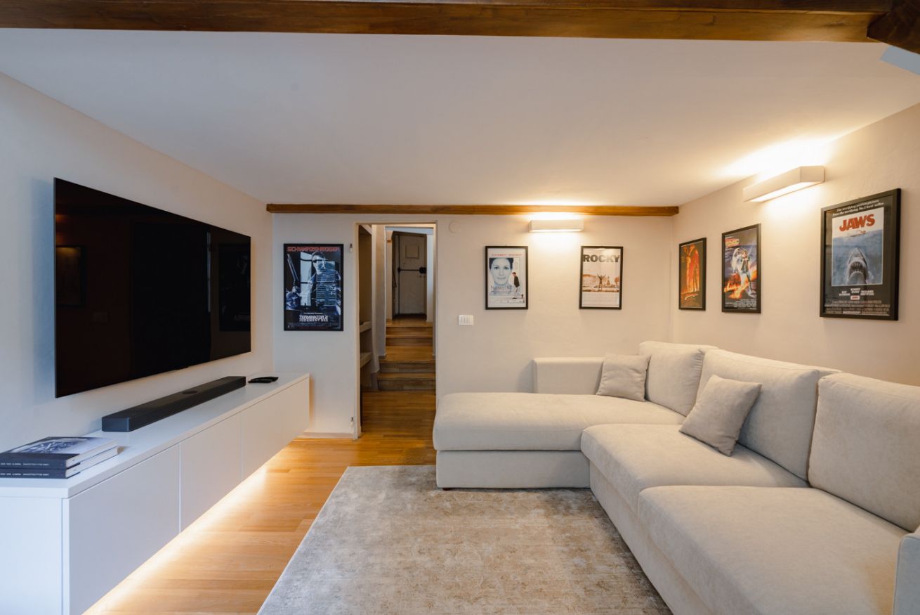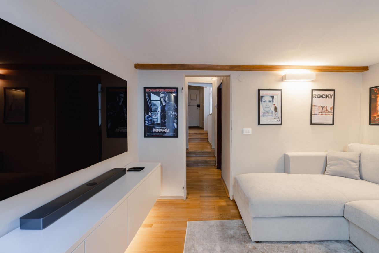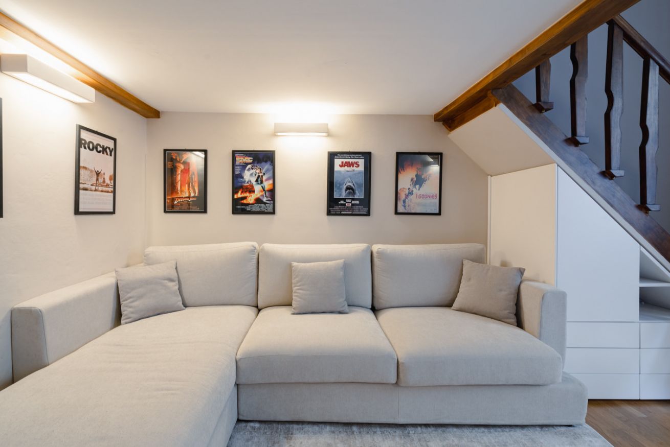 Zona giorno: un ampio salotto con divano ad angolo e TV a schermo piatto, impreziosito da una parete decorata con poster di film vintage, che creano un'atmosfera accogliente e originale. È il luogo perfetto per rilassarsi dopo una giornata trascorsa alla scoperta della città.
