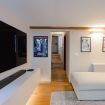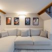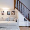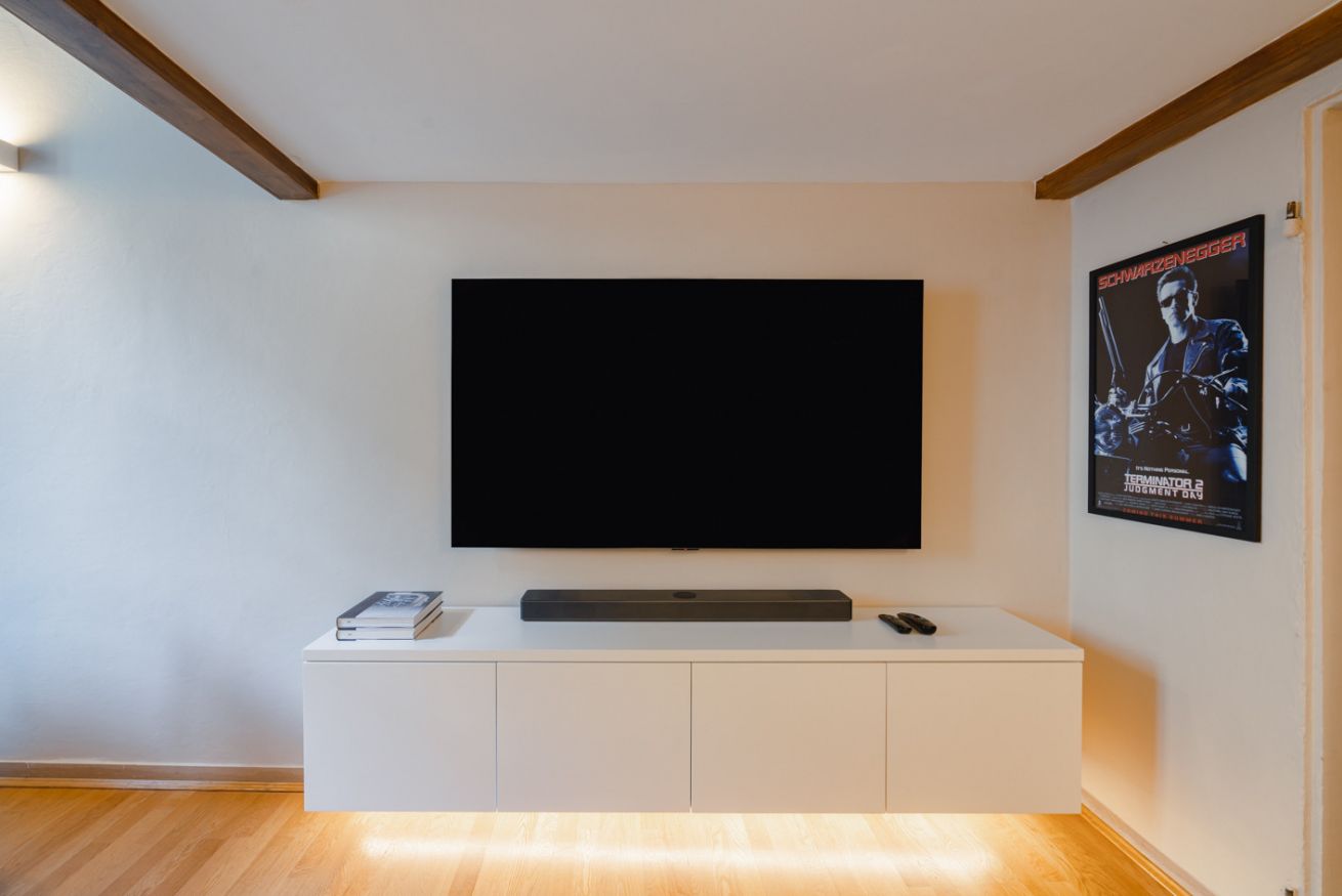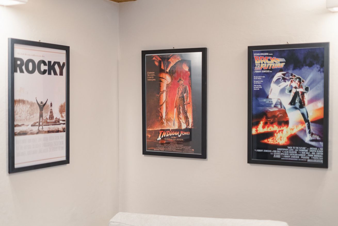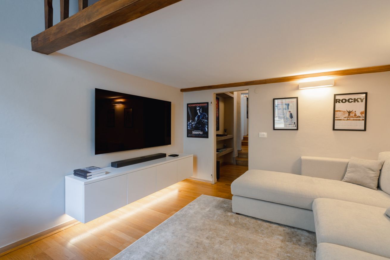 Zona giorno: un ampio salotto con divano ad angolo e TV a schermo piatto, impreziosito da una parete decorata con poster di film vintage, che creano un'atmosfera accogliente e originale. È il luogo perfetto per rilassarsi dopo una giornata trascorsa alla scoperta della città.
