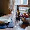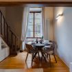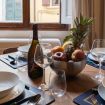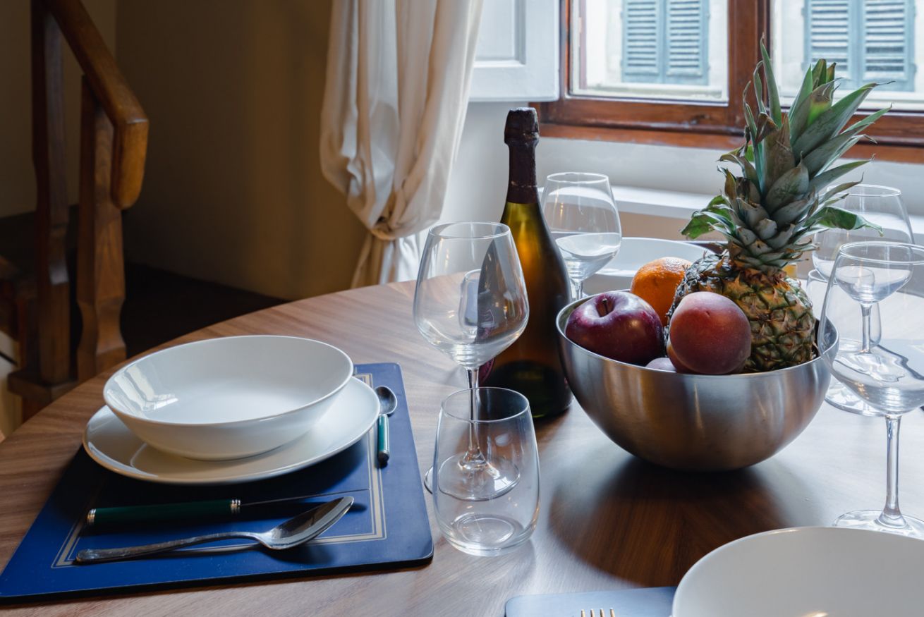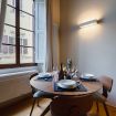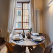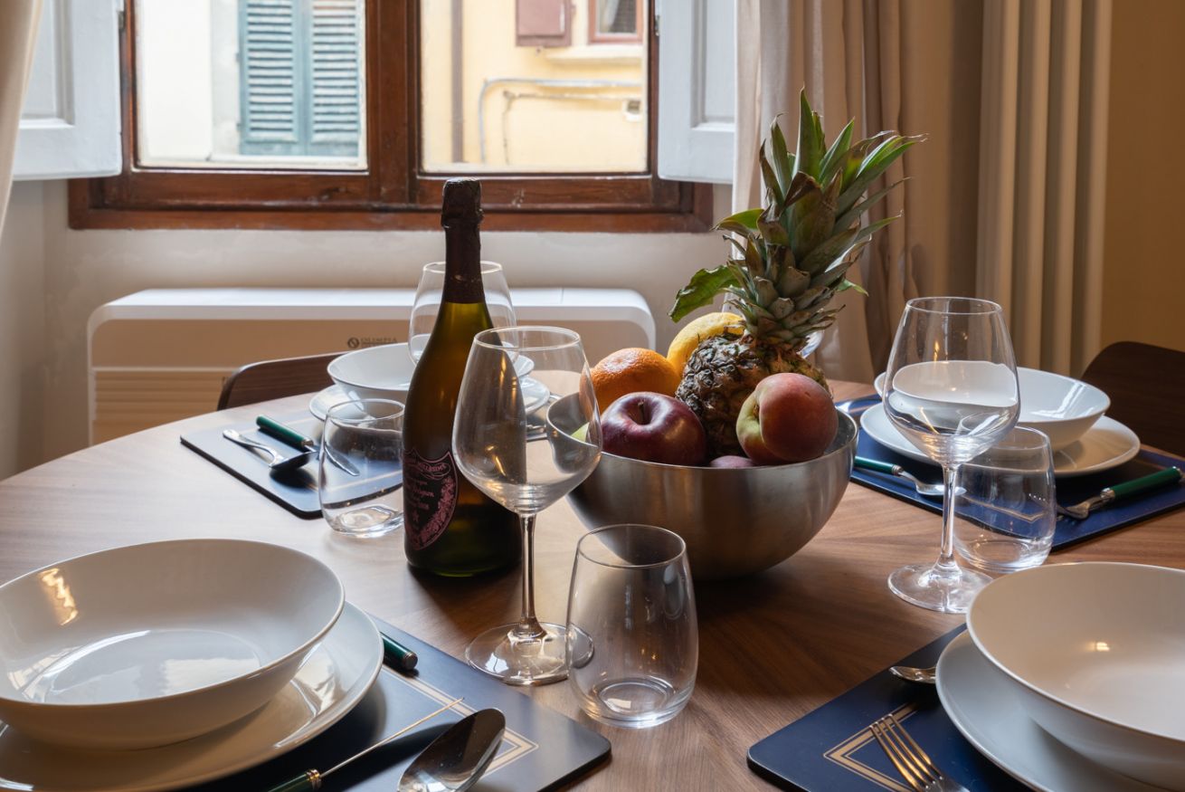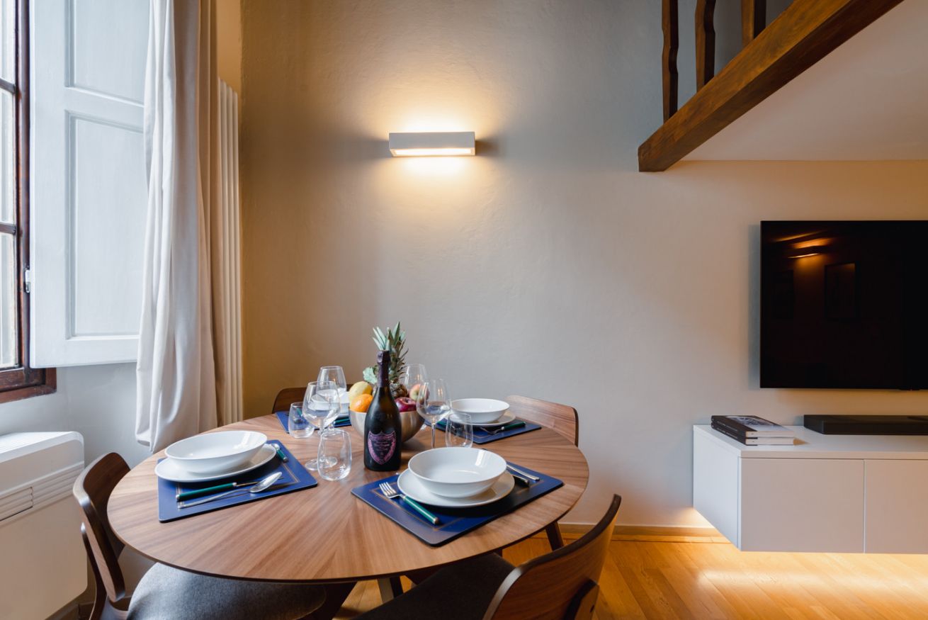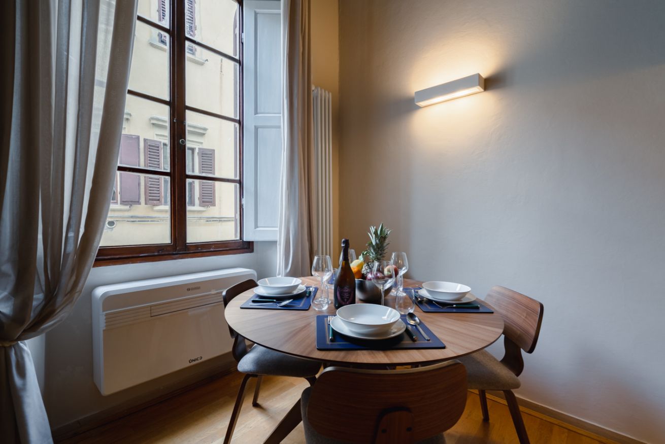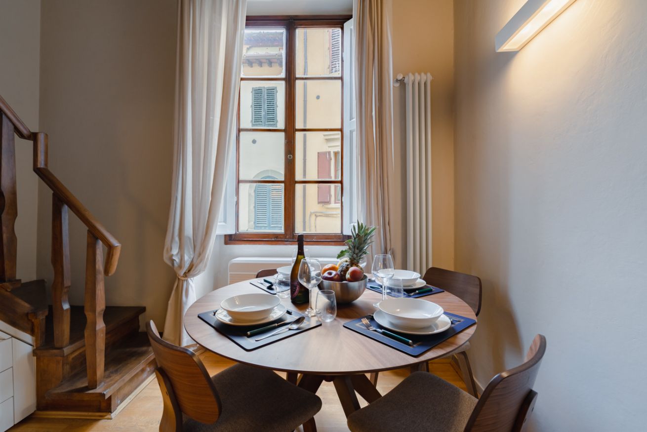 Zona pranzo: un tavolo rotondo in legno con quattro sedie, posizionato davanti a una grande finestra che lascia entrare la luce naturale e si affaccia su un incantevole vicolo fiorentino.
