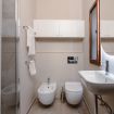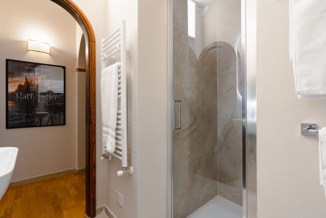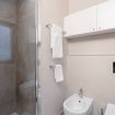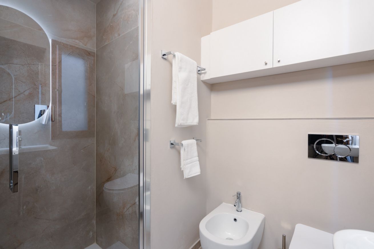 Bagno: elegante e completamente attrezzato, con una spaziosa doccia, lavandino moderno, WC e bidet. Toni neutri e materiali di qualità garantiscono il massimo comfort.