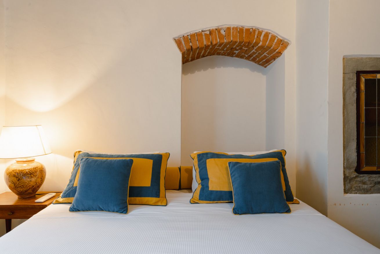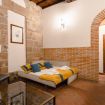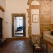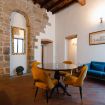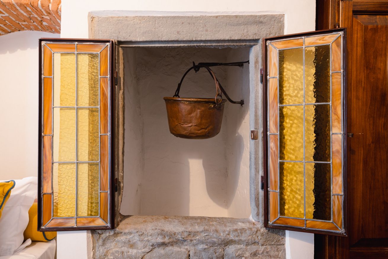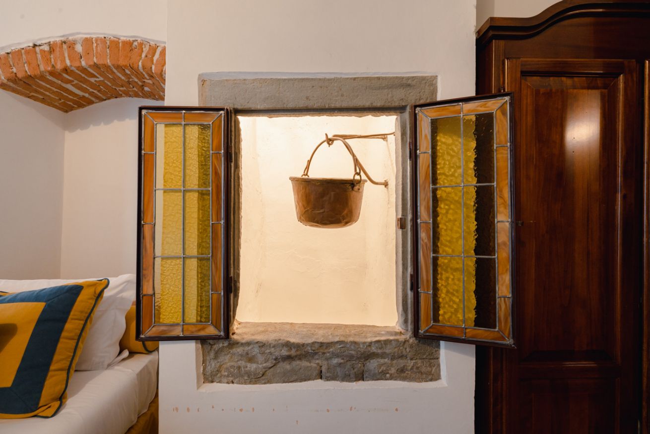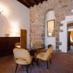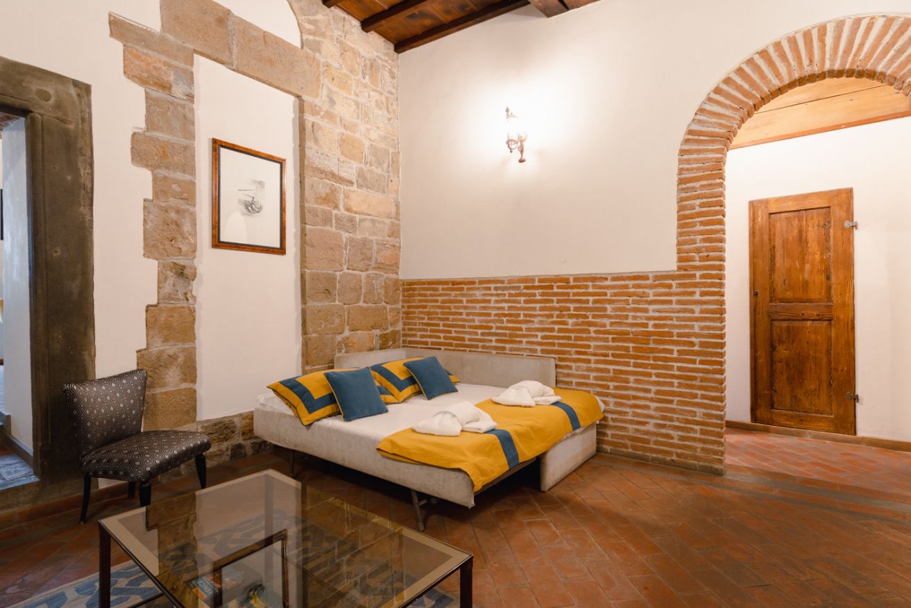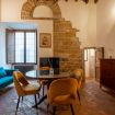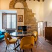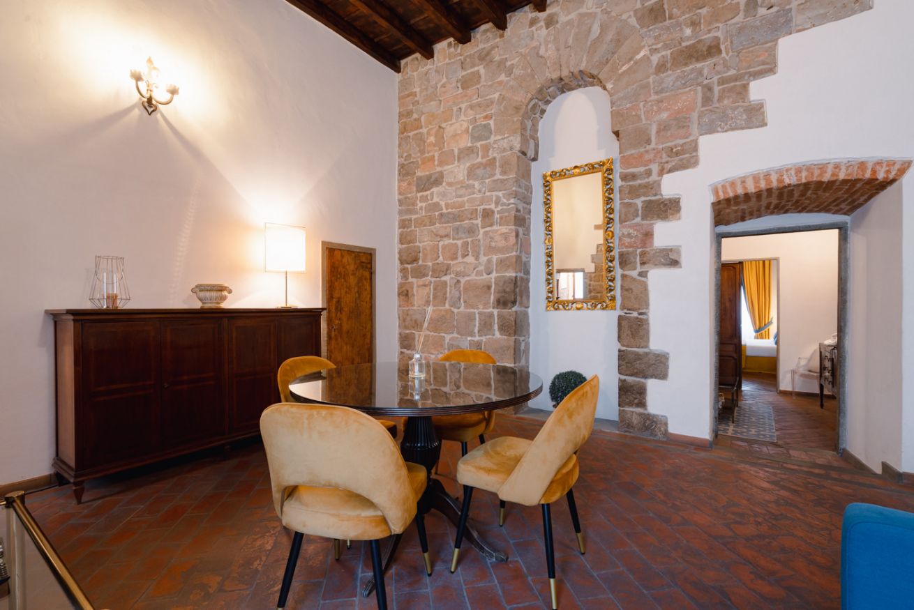 Gli autentici inserti medievali dialogano con arredi di design, creando un’atmosfera calda, sofisticata e scenografica.
