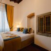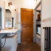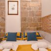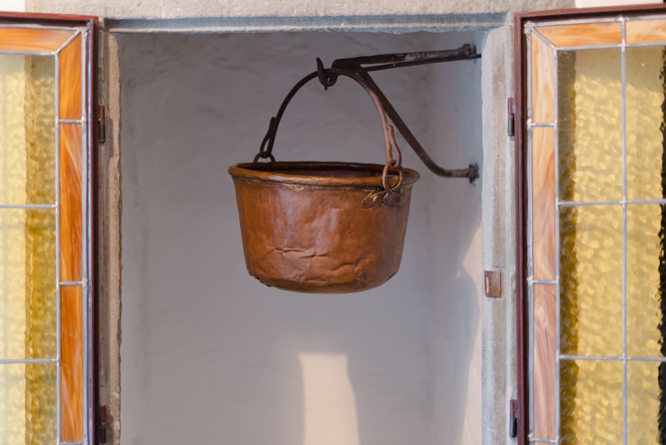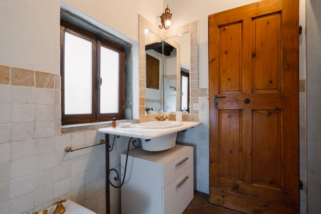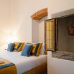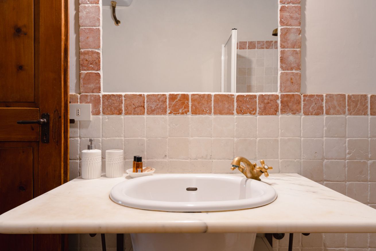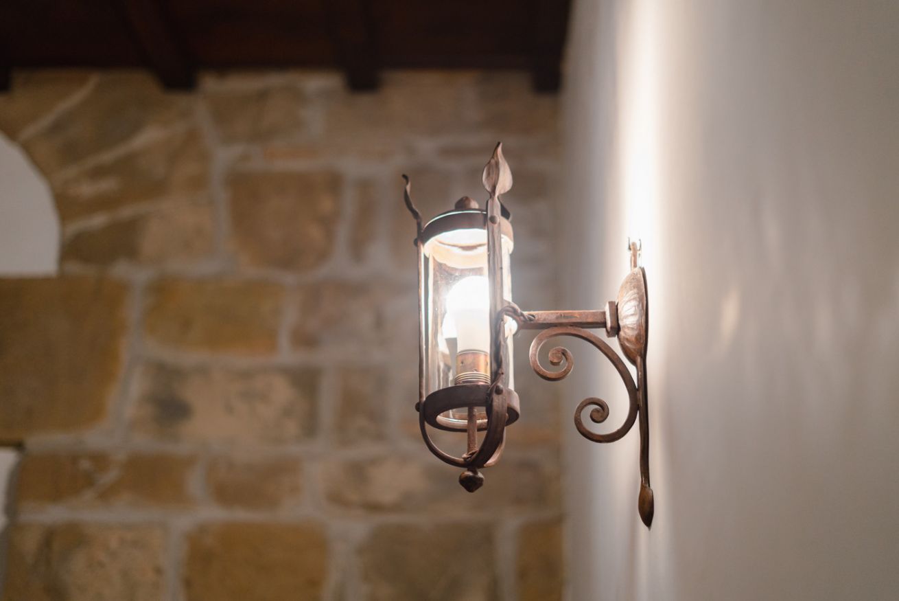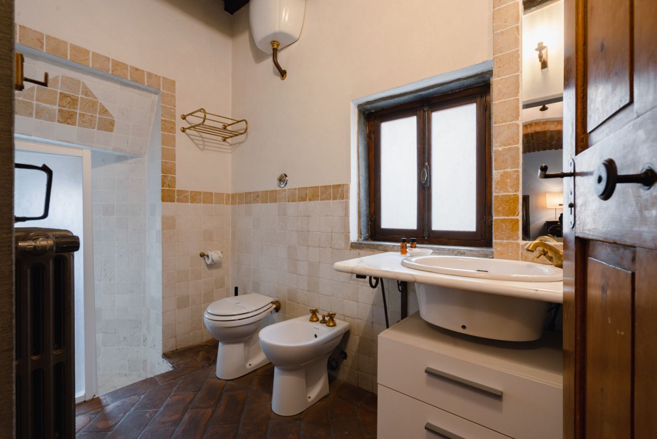 Gli autentici inserti medievali dialogano con arredi di design, creando un’atmosfera calda, sofisticata e scenografica.